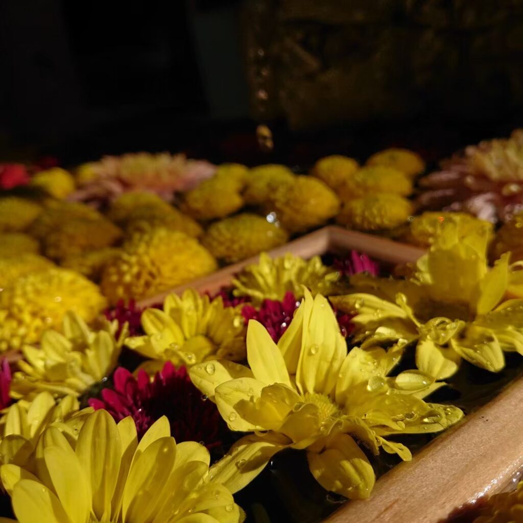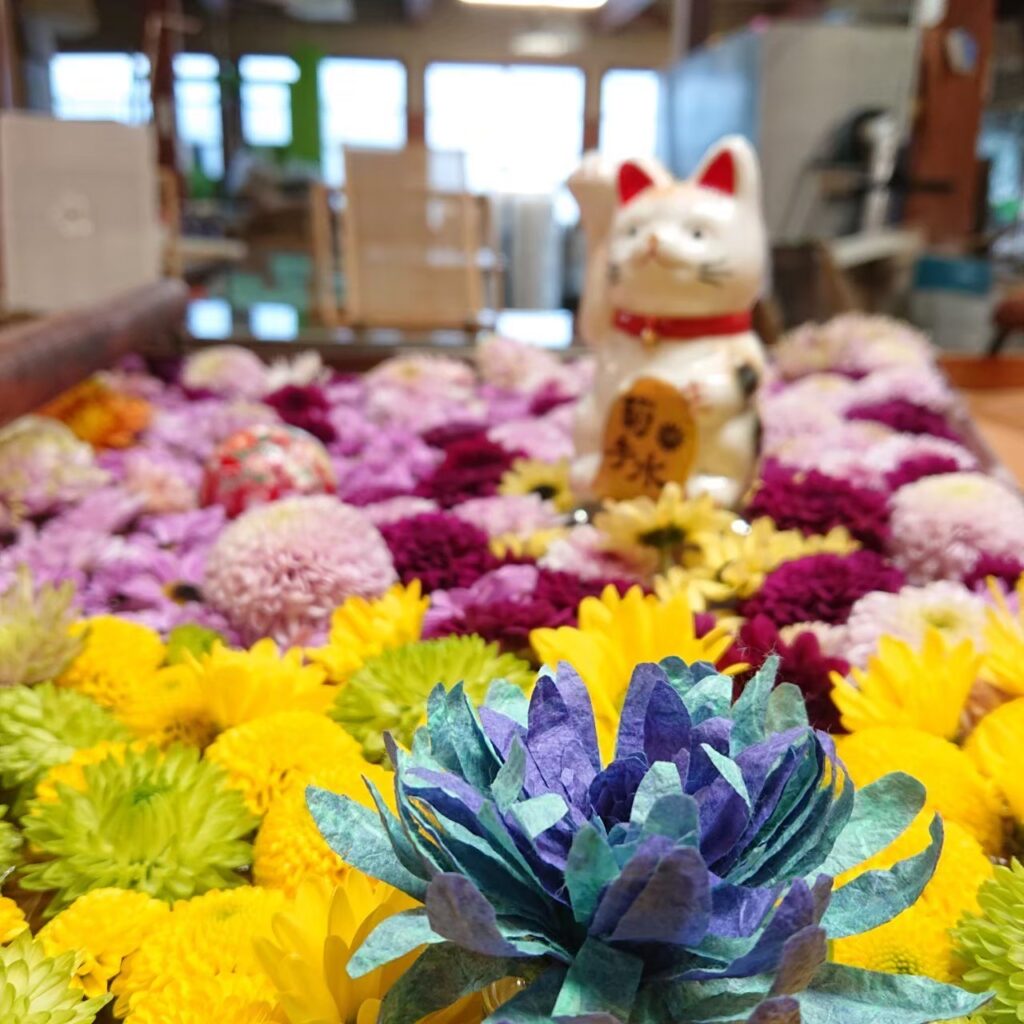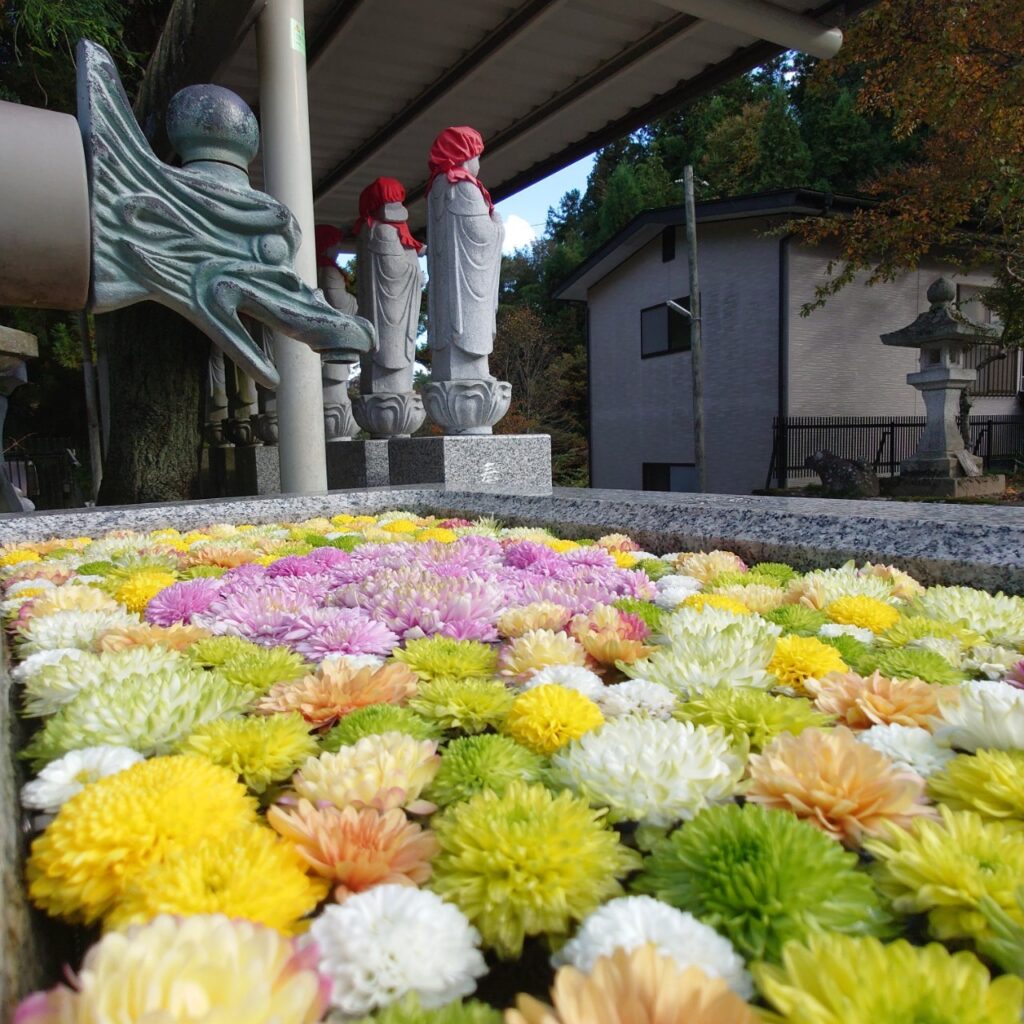 古くから伝わる「和の菊」に加え、ポップで可愛らしい「洋菊(マム)」も使用することで、伝統と新しさが融合した華やかな空間を演出しています。二本松ならではの菊手水をぜひお楽しみください。