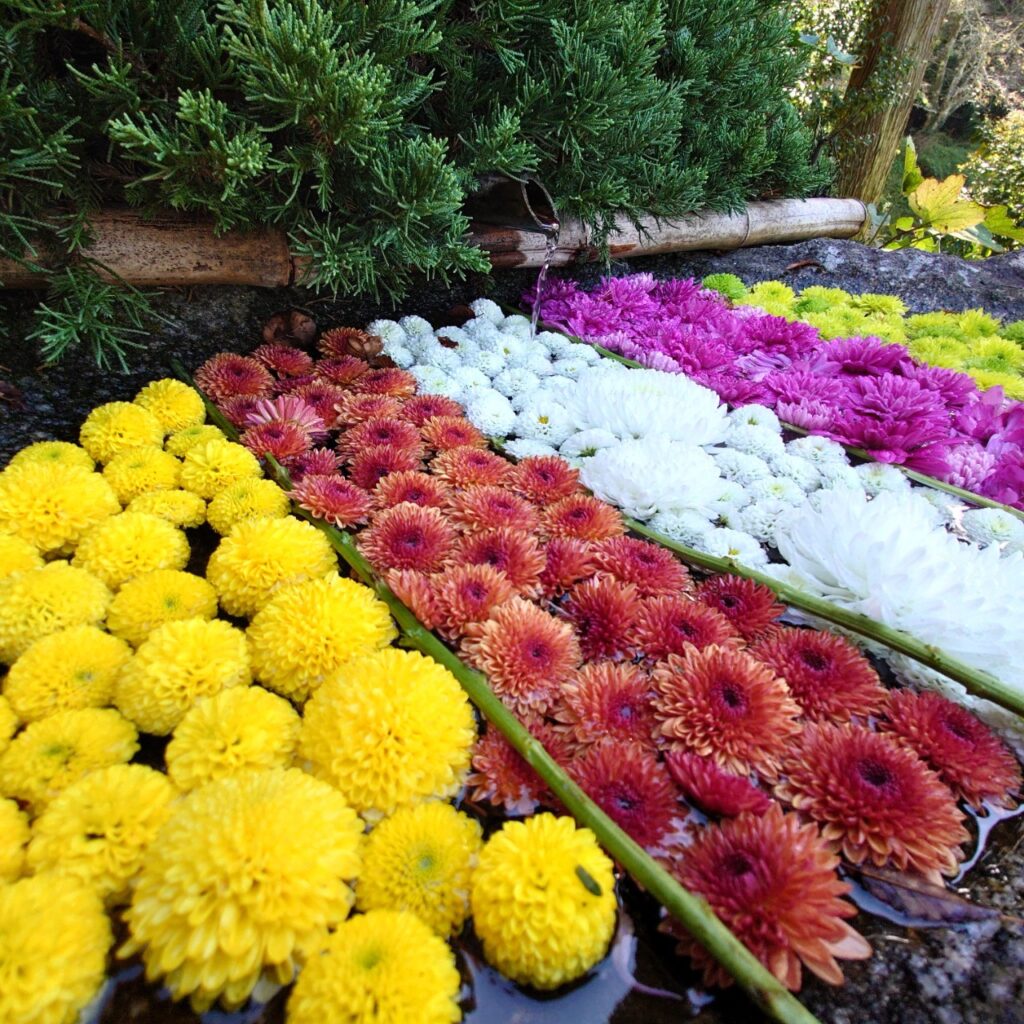 ”菊は鑑賞するだけではない、”まちを彩る” 楽しみ方を広げたい”という想いから、市内の寺社や施設にご協力いただき、色とりどりの菊を手水鉢に浮かべて展示しています。