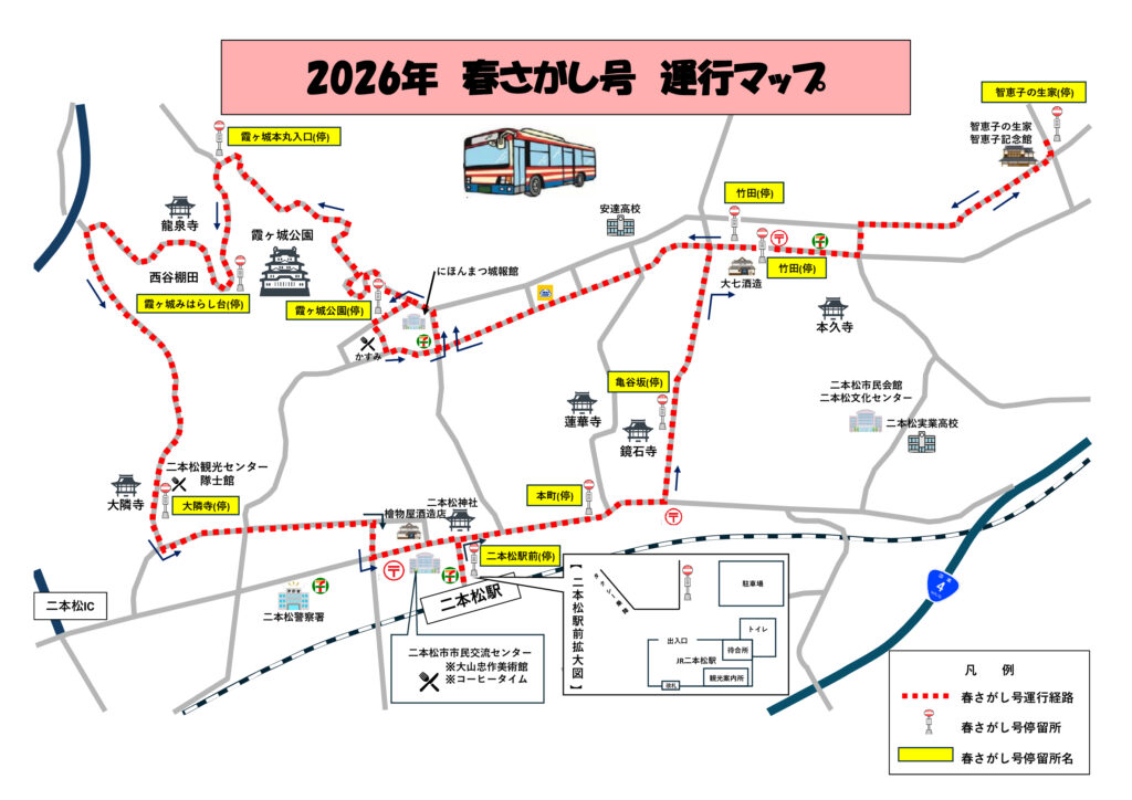 陽光に春を感じる季節となりました。 二本松市内の桜の名所や旧跡をゆっくりと巡る臨時バス「二本松春さがし号」が、今年も期間限定で運行されます。
