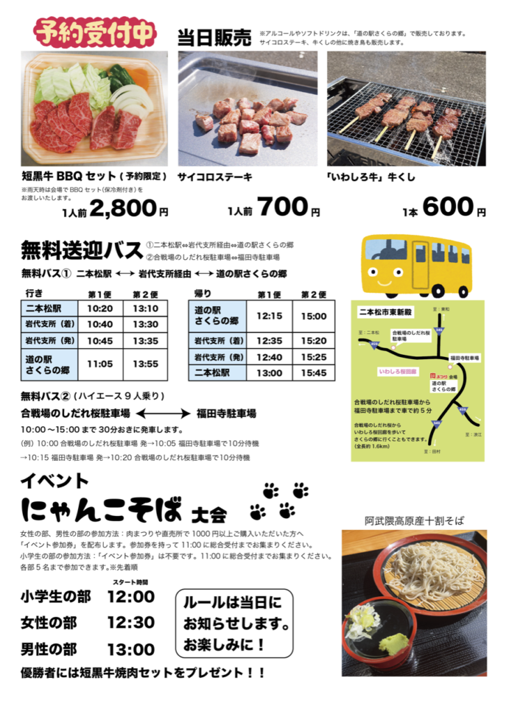美しい桜に囲まれて、岩代自慢のお肉とお蕎麦を楽しみませんか? 皆様のご来場を心よりお待ちしております!
